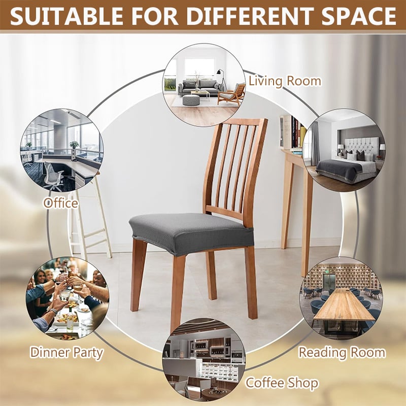 The dining chair seat covers are applicable for seat cushion length and width: 16”-19”, thickness: 2”-4”. Detailed information please refer to the size picture. Please measure your chair seat size before purchasing.